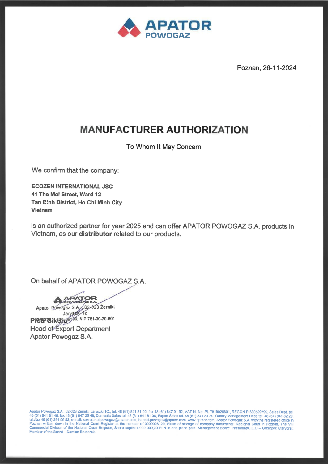 Với sự hợp tác chiến lược cùng Apator, Ecozen cam kết mang đến cho khách hàng những sản phẩm chất lượng cao và dịch vụ tốt nhất và không ngừng nỗ lực để đáp ứng nhu cầu của khách hàng và đem lại những giải pháp tiên tiến, hiệu quả cho ngành nước.