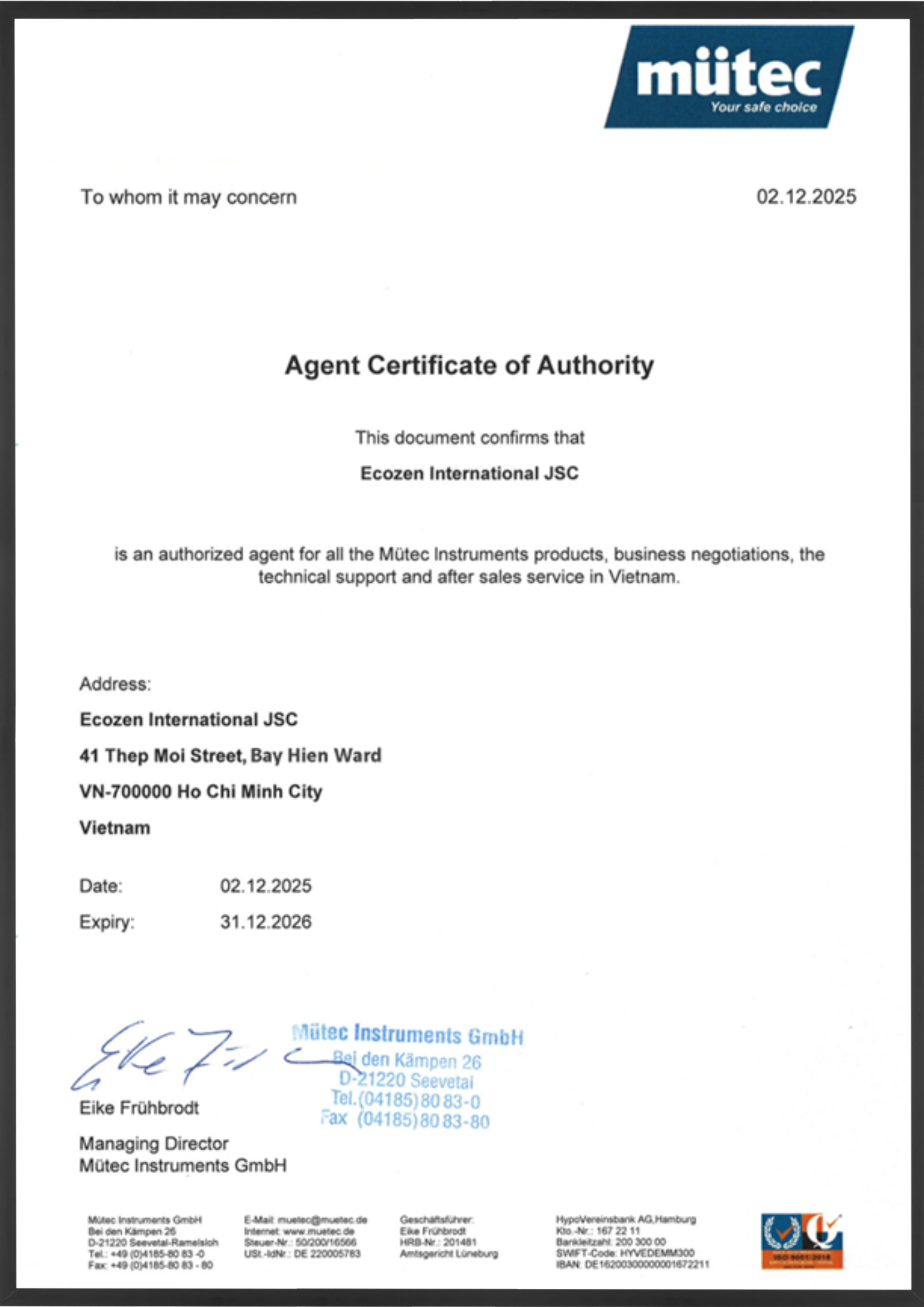 Với hơn 17 năm kinh nghiệm trong lĩnh vực thiết bị công nghiệp, Công ty Cổ phần Quốc tế Thiền Sinh Thái (ECOZEN) tự hào là nhà phân phối được ủy quyền chính thức của Mütec Instruments GmbH (Đức) tại thị trường Việt Nam.