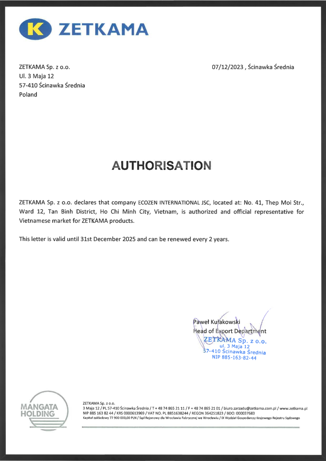 Với hơn 15 năm kinh nghiệm và sự am hiểu sâu sắc thị trường Việt Nam, Công Ty ECOZEN tự hào là đối tác phân phối chiến lược và đại lý ủy quyền chính thức của ZETKAMA (Ba Lan). Chúng tôi mang đến các giải pháp van công nghiệp hàng đầu châu Âu, cam kết 100% hàng chính hãng, đầy đủ giấy tờ CO, CQ cùng dịch vụ kỹ thuật và hỗ trợ chuyển đổi số toàn diện.
