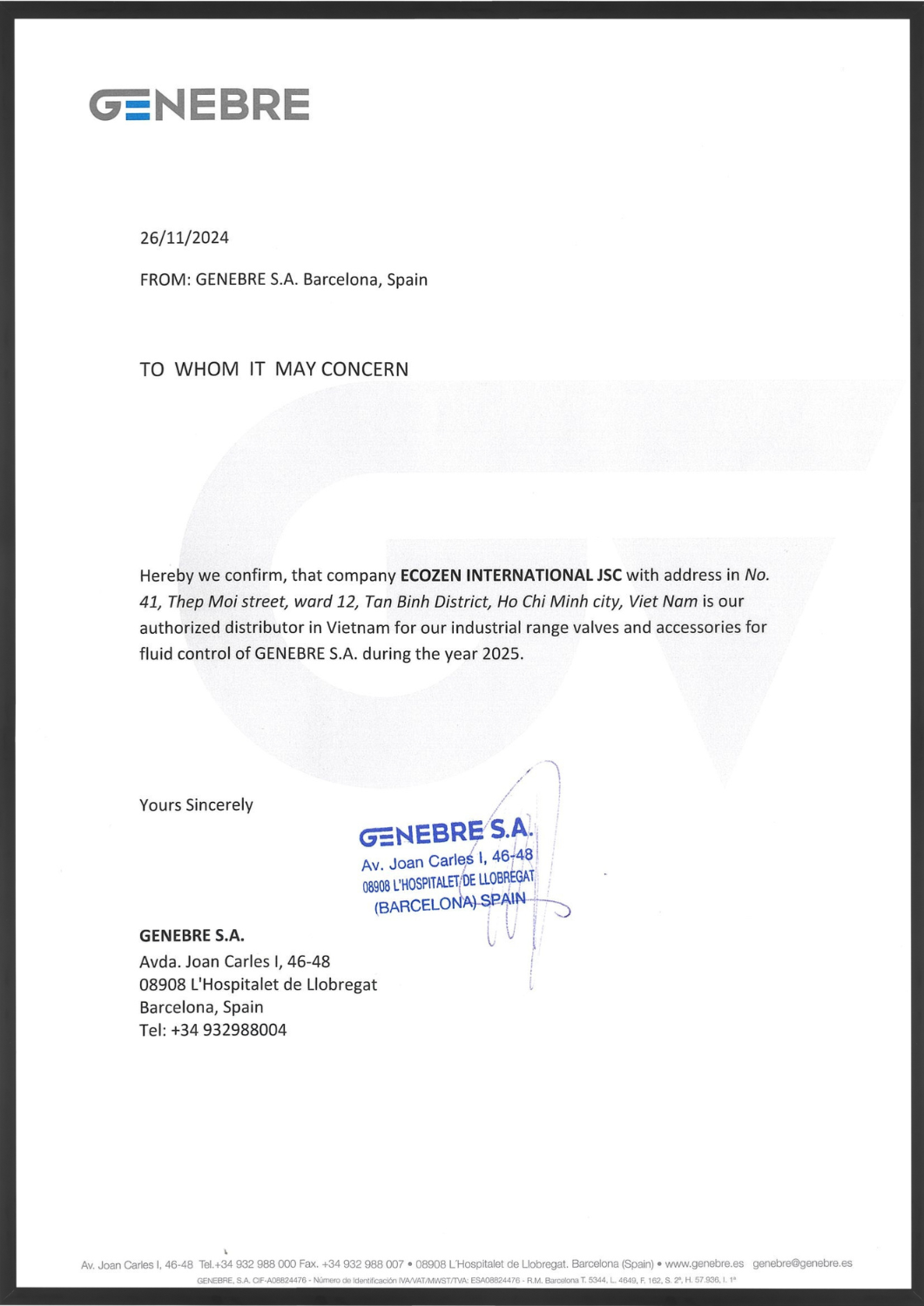 Công ty ECOZEN tự hào là đối tác chiến lược và nhà phân phối chính thức của GENEBRE S.A. (Tây Ban Nha) tại thị trường Việt Nam. Sự hợp tác này mang đến cho khách hàng Việt Nam quyền tiếp cận trực tiếp các dòng van, phụ kiện và giải pháp điều khiển lưu chất chất lượng hàng đầu thế giới, cam kết sản phẩm chính hãng, đầy đủ chứng nhận và dịch vụ kỹ thuật chuyên sâu.