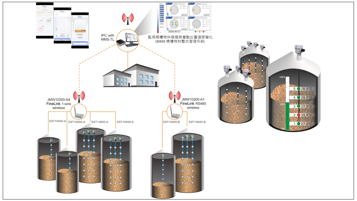 - Hỗ trợ kết nối tối đa 255 silo, mỗi silo có thể gắn 19 cáp cảm biến EST.