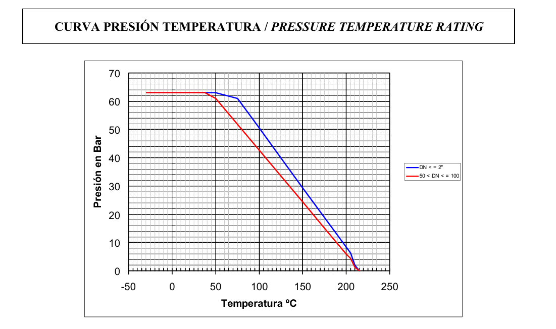 Sự khác biệt lớn nhất của Model 2014 nằm ở biểu đồ quan hệ Áp suất – Nhiệt độ. Nhờ vật liệu gioăng PTFE + 15% G.F, van có thể duy trì khả năng chịu áp lực tốt ngay cả khi nhiệt độ tăng cao. Cụ thể, van chịu được áp suất tối đa 63 bar ở nhiệt độ thường, đáp ứng tốt các hệ thống yêu cầu áp lực lớn mà các loại van bi đồng hoặc van bi inox thường không đáp ứng được.
